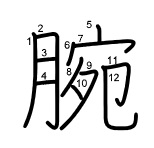 - 腕 (팔뚝 완) 훈독:うで 음독:わん (예)手腕(しゅわん):수완