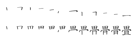 다음은 田(밭 전)과 亅(갈고리 궐)을 부수로 하는 한자 畳(겹칠 첩)와 争(다툴 쟁)에 대해서이다.